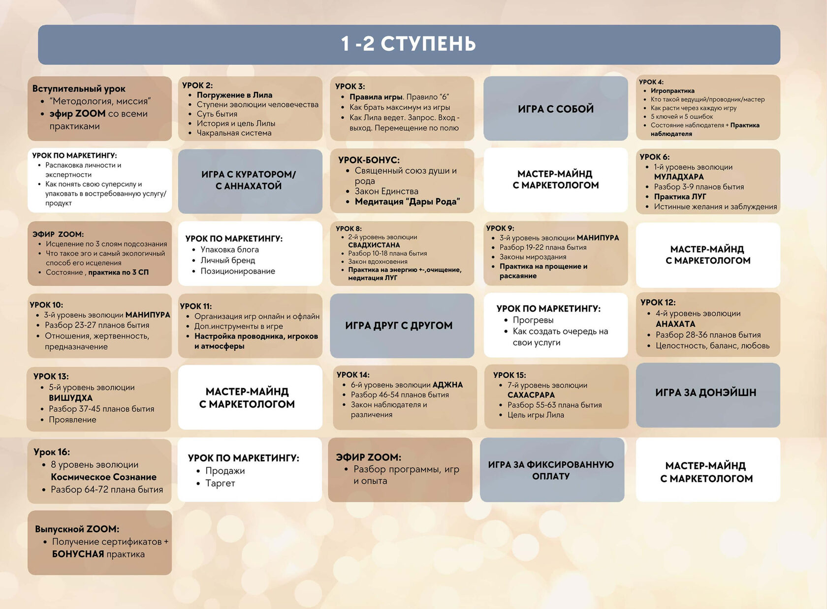 — 6 ТЕРАПЕВТИЧНИХ медитацій — Інтенсиви з підвищення кваліфікації для випускників — Зворотній зв'язок (куратор у чаті + Аннахата) — Групова гра Ліла з куратором — Сертифікат (3 мови) — Бокс «Ліла Нового Часу» — Блокнот, брендована сумка — Розбір по Матриці душі — Курс по таргету та інструкція chat GPT (для допомагаючих практиків) — Бібліотека матеріалів