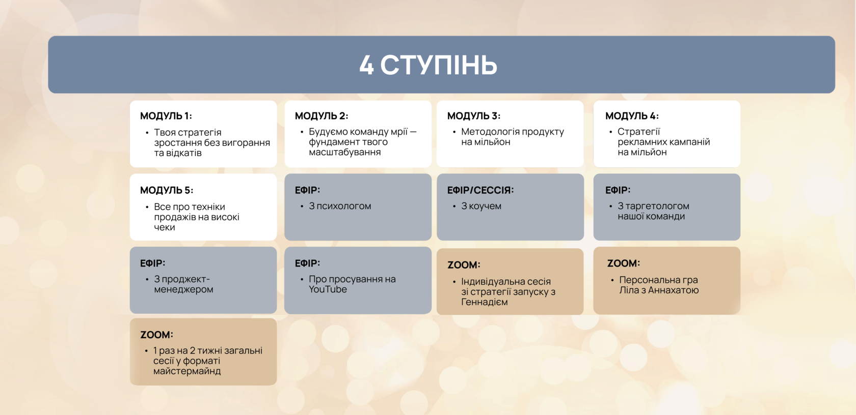 Модуль 1. Твоя стратегія зростання без вигорання та відкатів Модуль 2. Будуємо команду мрії — фундамент твого масштабування Модуль 3. Методологія продукту на мільйон Модуль 4. Стратегії рекламних кампаній на мільйон Модуль 5. Все про техніки продажів на високі чеки