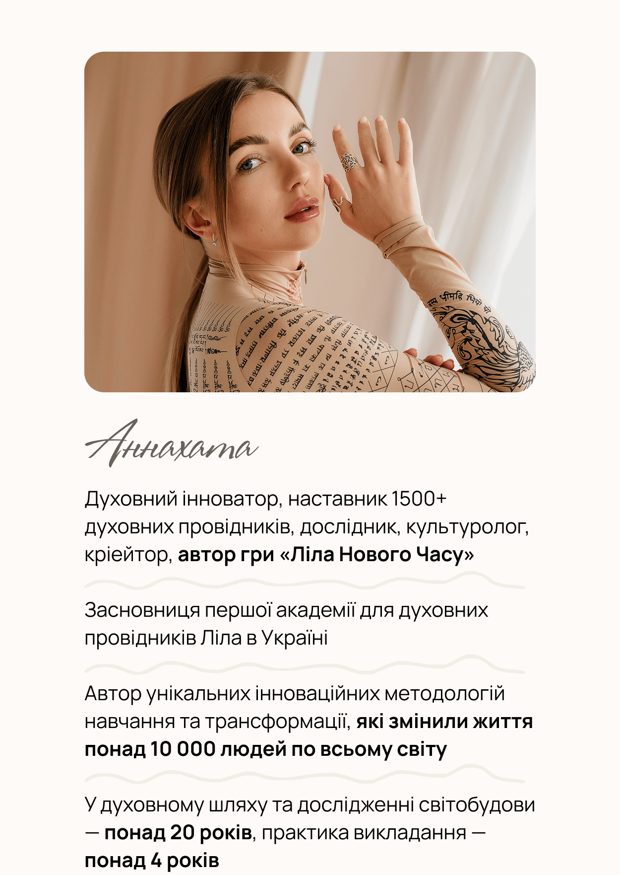 Це найсучасніша і найглибша база знань, яка поєднує гру Ліла, психологію, просування та маркетинг — 3 місяці навчання і ти в професії духовного провідника з доходом 2000$ на місяць🔥