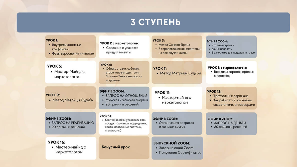 Модуль 1. Монетизація / маркетинг (4 уроки, 4 майстермайнди) Модуль 2. Основи психіки +30 інструментів та технік (7 уроків) Модуль 3. Розбір запитів +40 інструментів та технік (4 ефіри) Модуль 4. Створення та упакування свого навчання (3 уроки, 3 майстермайнди)
