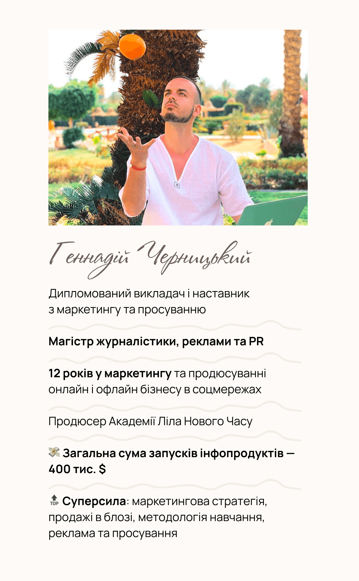 Якщо ти хочеш системно просуватися, розвивати свій особистий бренд, запускати свої програми (курси, ретрити, наставництво, онлайн заходи)